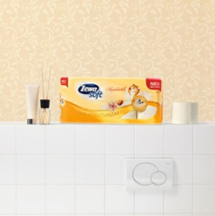 Riechen, sehen und fühlen – Zewa Soft lädt Sie mit „Das Verwöhnzarte“ zu einer verwöhnenden Sinnesreise ein! Ein Hauch von Mandelmilch verleiht den vier elegant geprägten Komfortlagen besondere Weichheit. Der angenehm zarte Mandelduft verwöhnt die Nase.